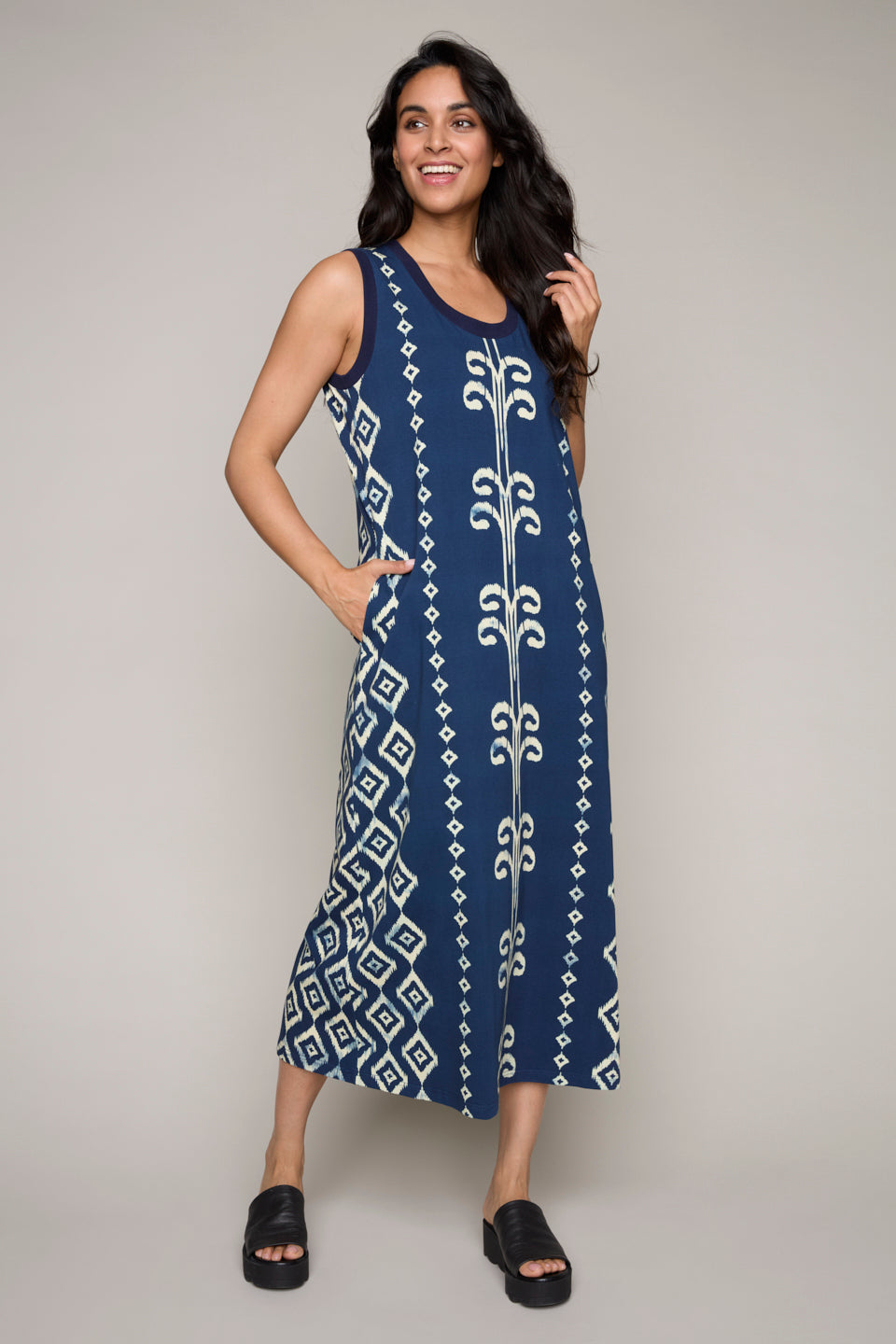 Navy Ikat Print Viscose Dress w/ Jersey Trim & Pockets