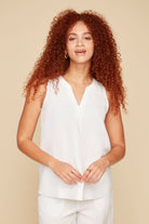 Elevate your style with our White Linen Blend Vneck Sleeveless Top. Classic and versatile, it pairs perfectly with any print or classic bottom for a chic and stylish look. The slight A-Line shape and front pleat give a lovely fit over the hips. The lightweight and comfortable linen blend fabric is sure to keep you looking and feeling great all day long. Upgrade your wardrobe today!