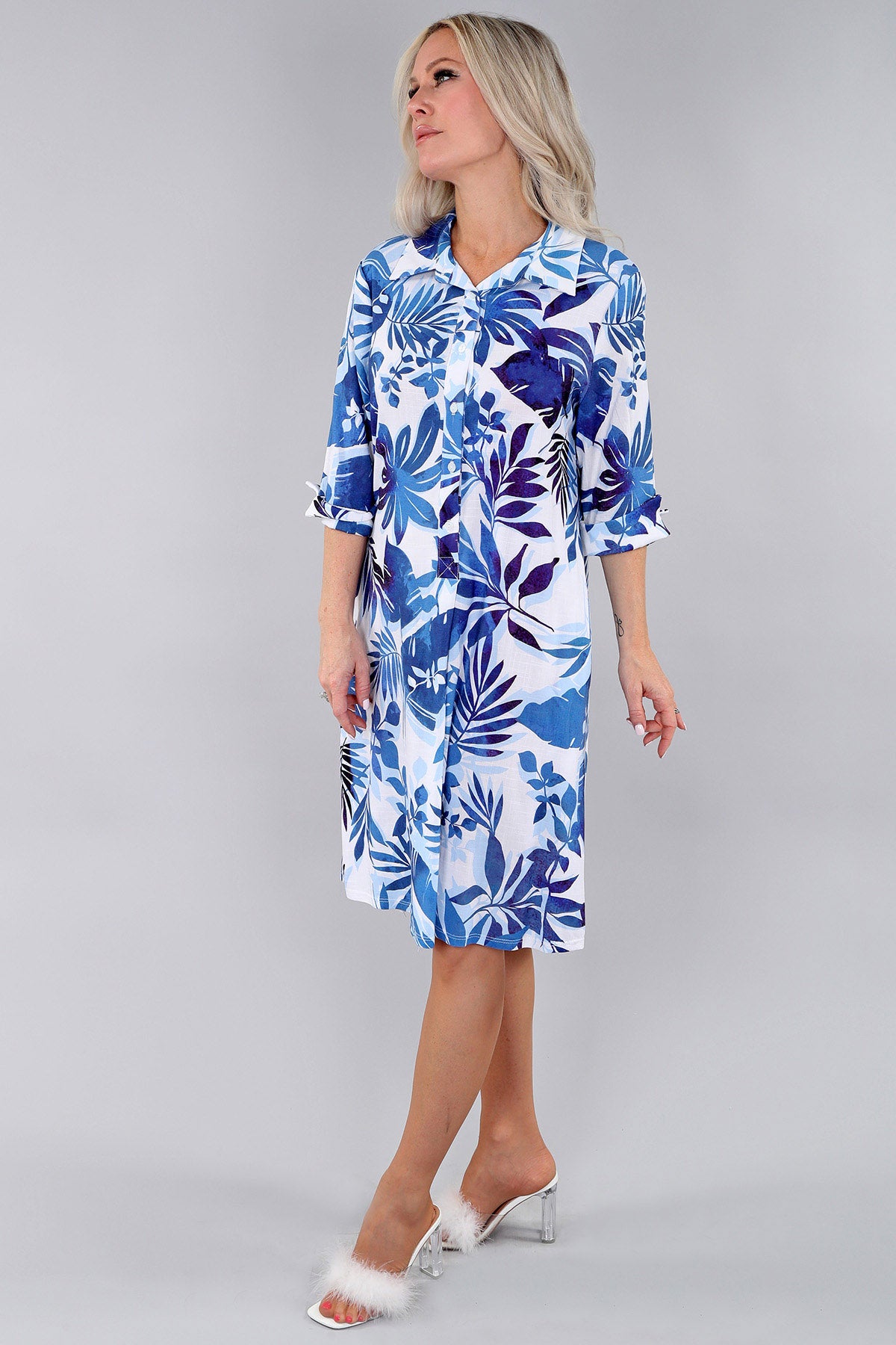 Aquamarine Mix Print Tab Sleeve Shirt Dress