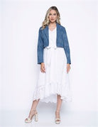 Indulge in the breezy charm of our White Cotton Eyelet Sleeveless Vneck Dress. Made with intricate eyelet cotton, this dress exudes a high low boho style that will turn heads. Embrace the effortless elegance and feel the softness of cotton against your skin. Perfect for any occasion!
