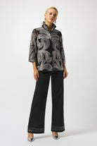 Make a statement with this soutache jacket, artfully designed on a black mesh backdrop for a stunning textural contrast. The three-quarter sleeves and four-button closure lend classic sophistication, while a soft wire in the mock collar allows for customizable shaping to suit your style. Perfect for adding a touch of elegance to any outfit, this jacket combines intricate detail with versatile wearability.