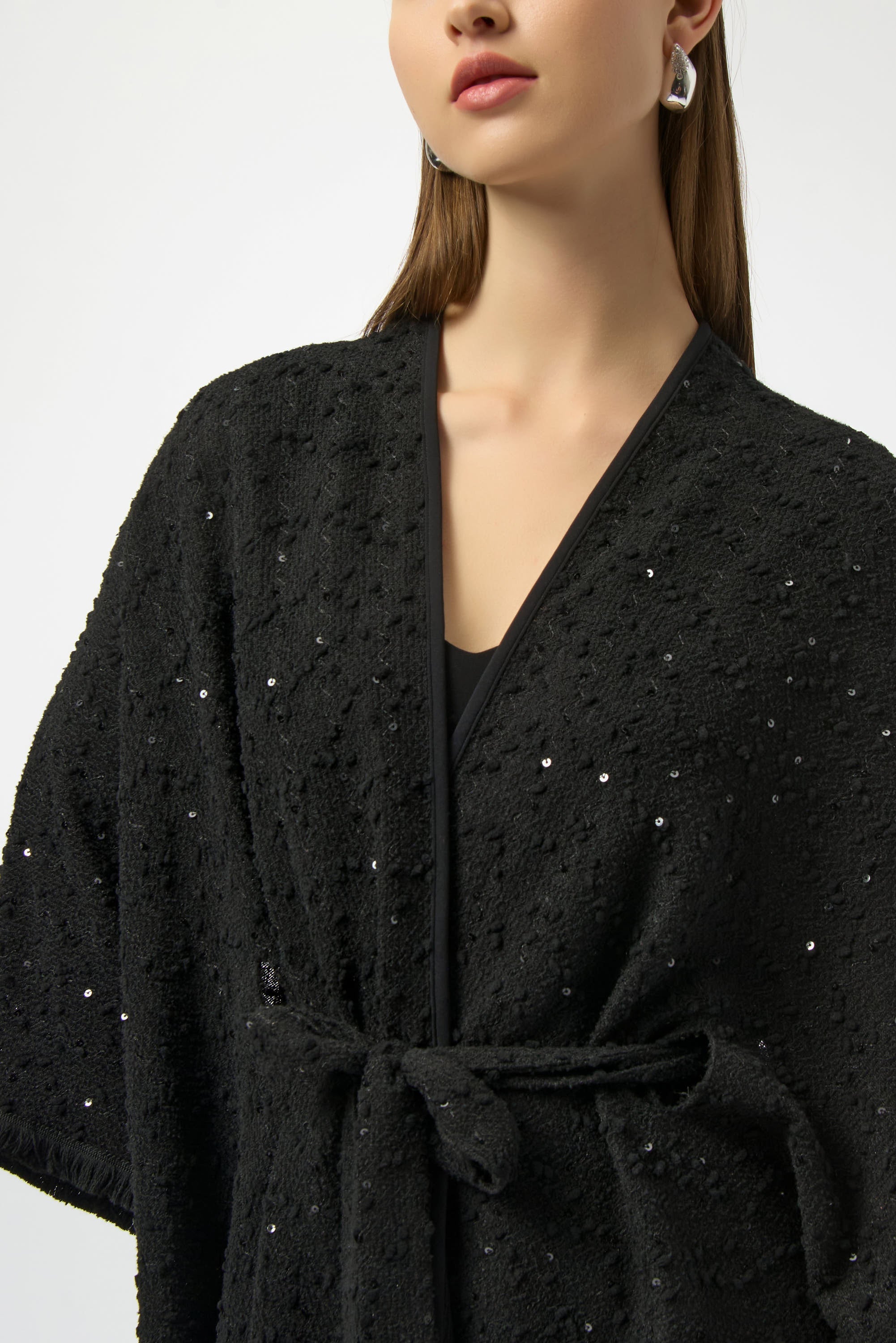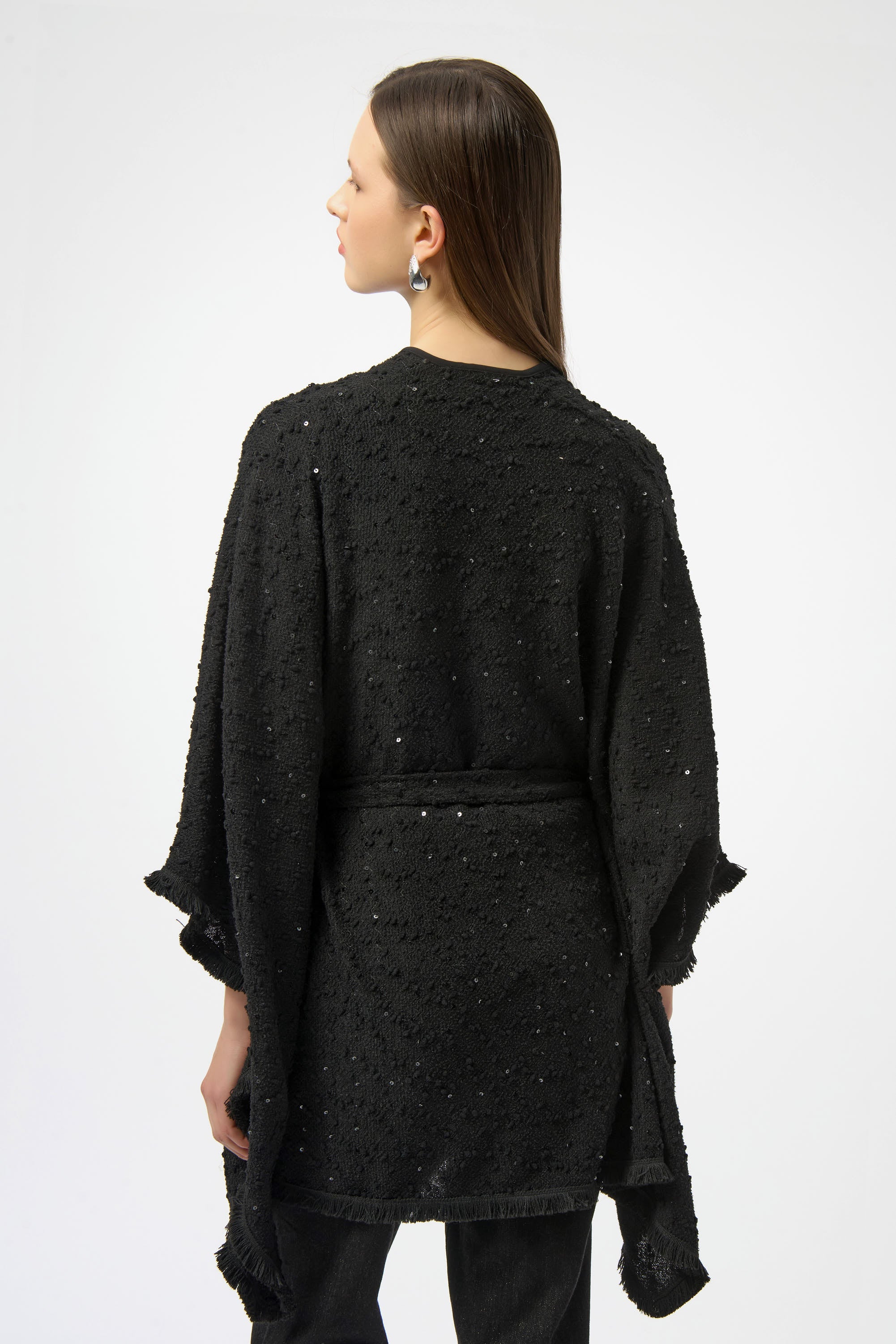 Drape yourself in effortless luxury with this sequin bouclé knit poncho, featuring an alluring wrap neckline and elegant kimono sleeves. The sleek belt at the front creates a lovely figure while the delicate fringe trim adds modern flair to a classic wardrobe staple.
