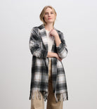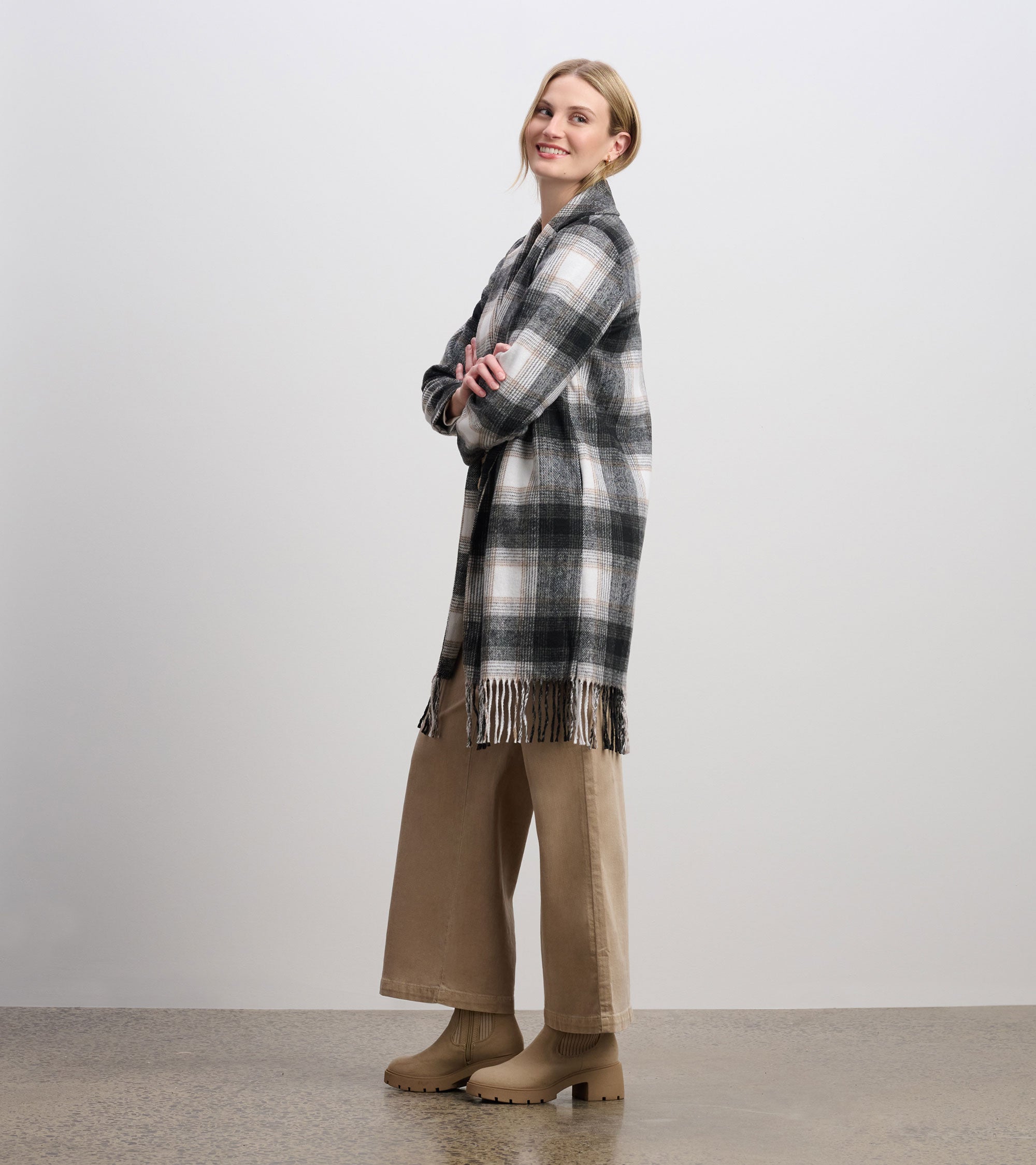 Black & Taupe Plaid Fringe Jacket This versatile shacket layers beautifully over everything from tees to sweaters. The classic plaid pattern in black and taupe works with any wardrobe, while the fringe detail adds subtle texture and movement. Fully lined for comfort and structure, it's designed to flatter petite frames without overwhelming. Perfect for transitional weather or as a lightweight layering piece year-round.