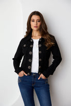 The Orly Signature Jacket offers rich black denim without any fading, making it ideal for dressing up or down. Featuring striking grey metal double buttons, this jacket delivers a sharp, versatile look that enhances any outfit with effortless style and sophistication.