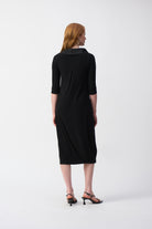 Rich in glamour and timeless appeal, this silky knit and memory dress will have you walking with the utmost confidence. A sleek cowl collar and three-quarter sleeves adorn the garment’s chic cocoon silhouette, falling gracefully below the knee. A delicate pocket and pleat details at the hemline and at the top back add a hint of more refinement to this modern design.