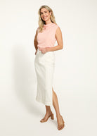 Introducing the Ivory Stretch Denim Column Midi Skirt. Made with a flattering mid calf length and alluring side slits, this skirt offers a sophisticated and modern look. Made with stretch cotton denim for comfort and ease of movement. Perfect for any occasion.