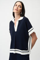 A captivating border stripe design graces this dry viscose and nylon yarn sweater, crafted in full needle stitch for texture and depth. The boxy fit, extended shoulder short sleeves, and contrast-colored polo collar offer a chic, modern silhouette, with side slits at the hem adding fluid movement.