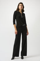 Revel in the sheer elegance of this beautiful silky knit top. The piece features a charming fitted silhouette with a bold shirt collar with a leatherette detail for added flair. The front placket with zipper detail accentuates the garment’s stunning contemporary look.