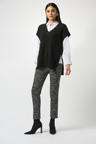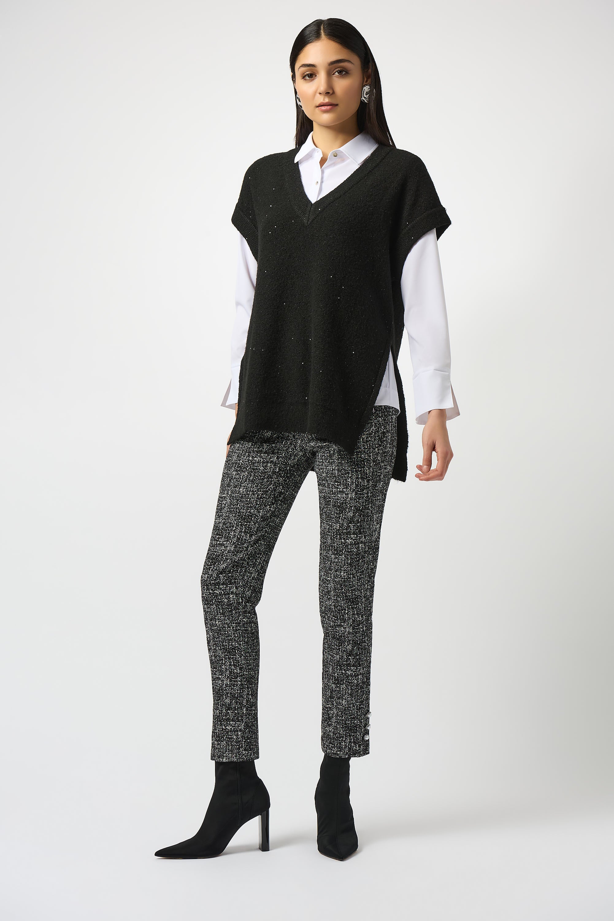 Our long-line sleeveless tunic is the epitome of masterful layering. Made from a soft sweater knit that provides just the right amount of warmth, this piece redefines cozy-chic with its flattering V-shaped neckline and subtle sequin detailing. Pair it with a crisp white button-down for a polished, office-ready look, or layer it over a simple top for effortless style.