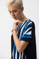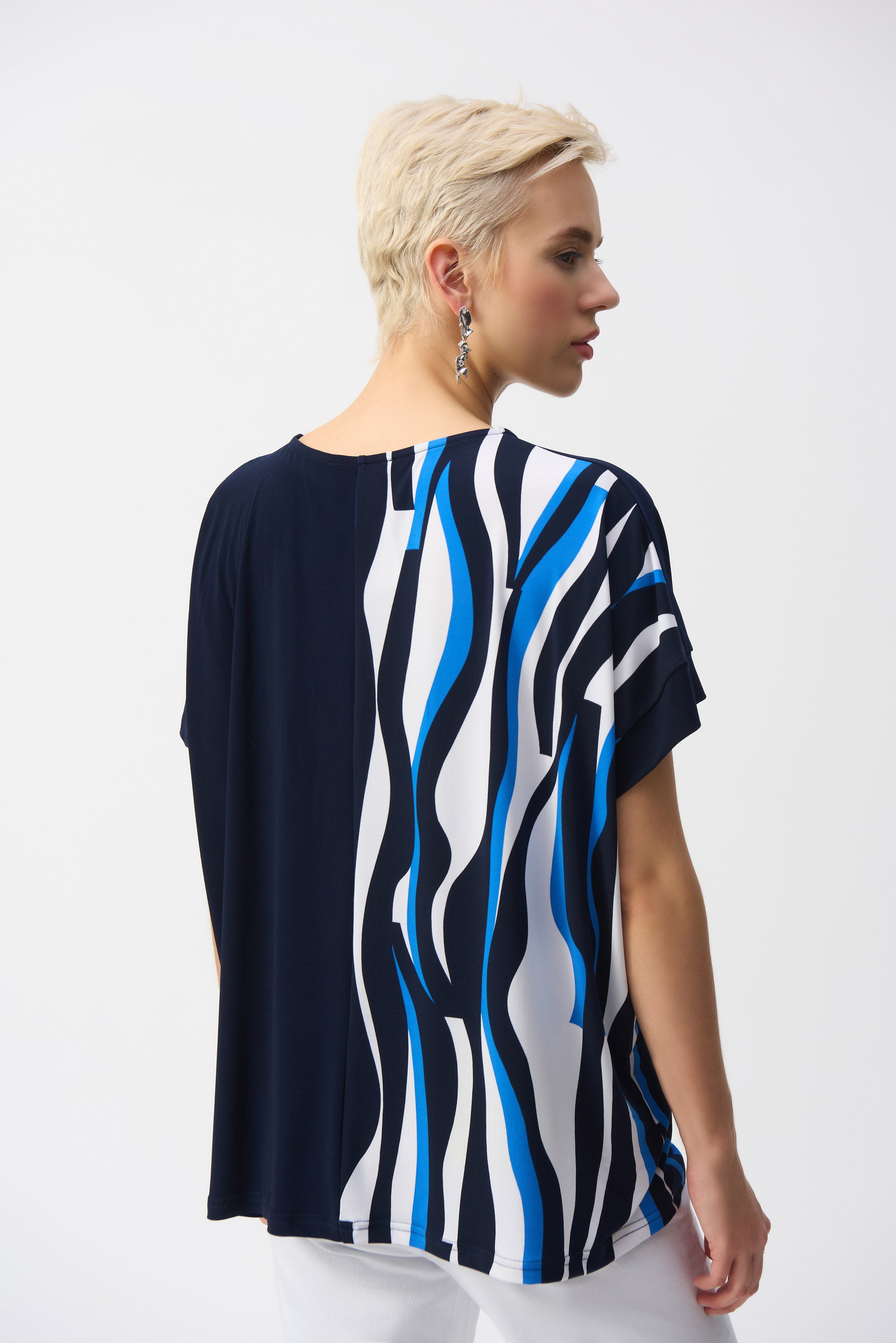 Solid and geometric print silky knit come together to create a visual delight that sets this casual top apart from the rest. Framed by a scoop neck and short cuffed dolman sleeves, this boxy top also displays a unique asymmetrical pocket.
