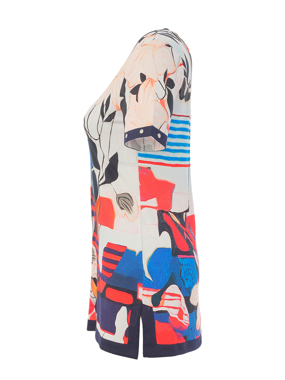 Discover the Simply Art Collection from Dolcezza, featuring this exclusive commissioned art print "Entrelacee 16" by Nathalie Maquet. This elegant V-neck tunic showcases classic navy, red, and white hues perfect for Spring/Summer. With short sleeves and a relaxed tunic length, it pairs beautifully with leggings or capri pants for effortless, artistic style.