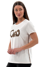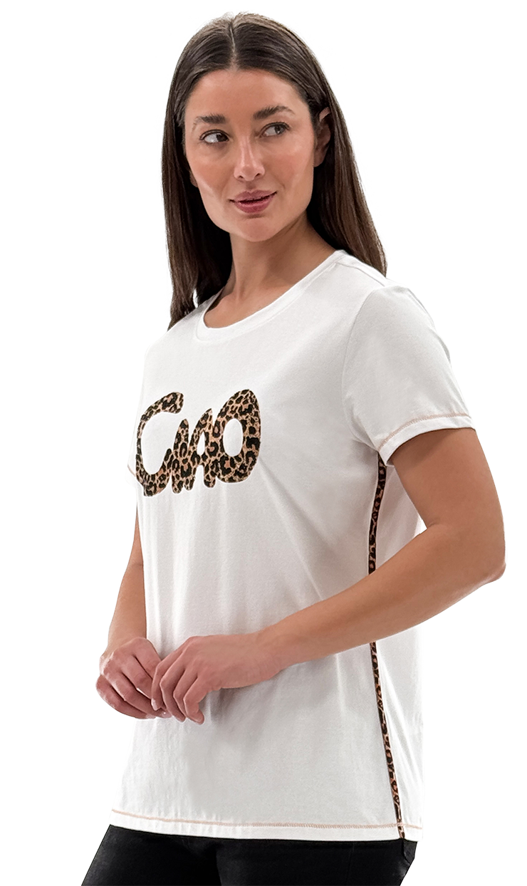 This White Animal Ciao Graphic Short Sleeve Top features stylish animal print piping down the sides that perfectly complements the matching print in the word "Ciao." Soft and comfortable, it adds a trendy edge to your casual wardrobe with a cohesive, eye-catching design.