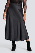 Experience effortless elegance with the Black Satin Luxe Maxi Skirt. Its A-line silhouette and bias-cut fabric offer a flattering drape and comfortable fit. The satin finish adds a touch of luxury, making it perfect for both casual looks with boots or more dressy occasions.