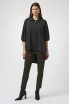 This stretch poplin tunic redefines classic tailoring with its high-low flared silhouette that adds grace to every movement. The shirt collar, complemented by a sleek button placket, and beautiful three-quarter puffed sleeves lend the piece its sophisticated allure.