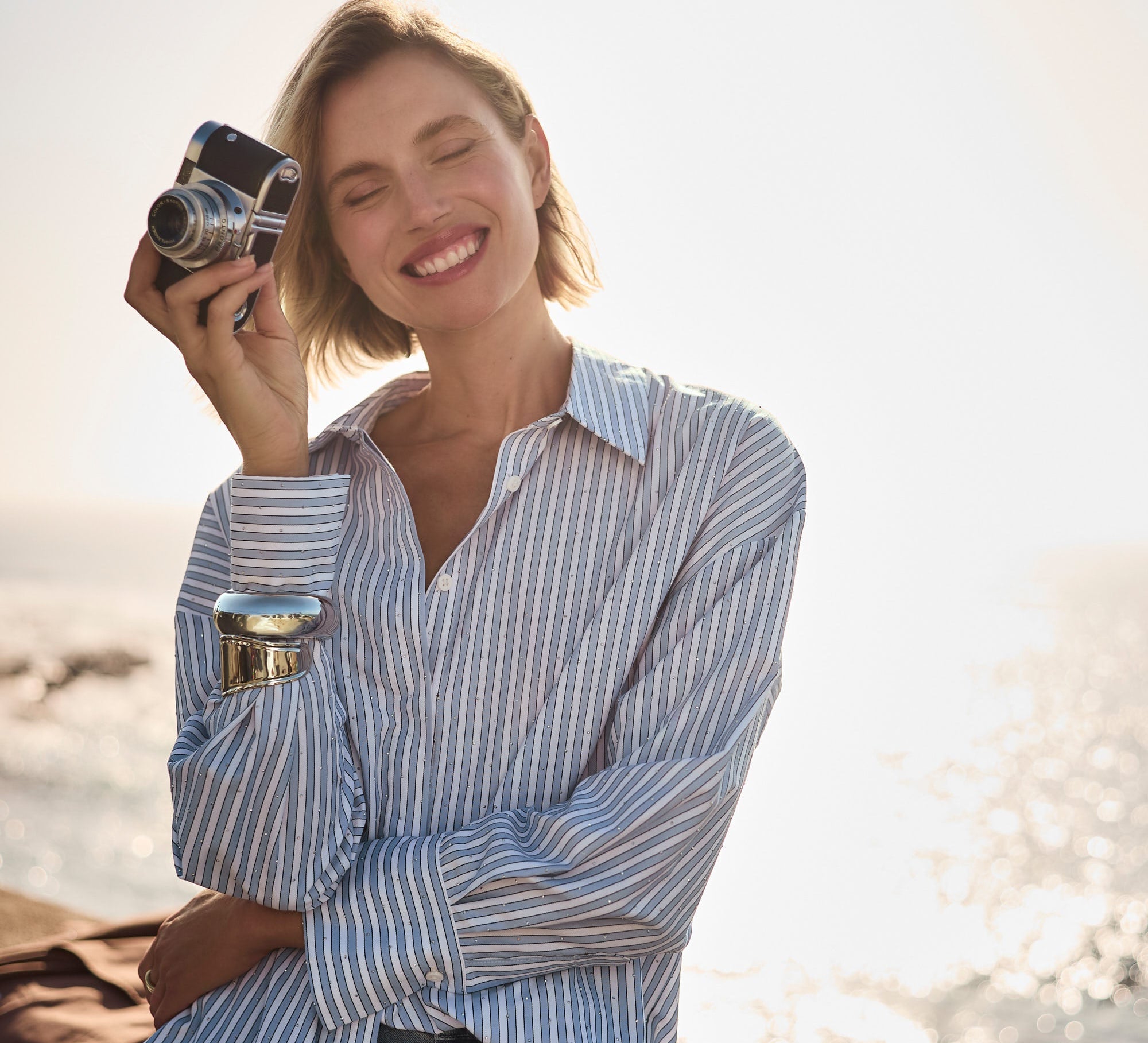 Crafted from lightweight Tencel, this woven striped blouse features a boxy silhouette and hidden button placket. All-over iron-on details add a unique touch to this casual, unlined piece.