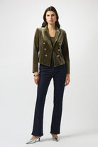 This velvet blazer encapsulates your flair for impeccable craftsmanship. The notched collar and fitted silhouette exude undeniable poise. The double row of decorative military buttons is the centrepiece of this exquisite garment and accentuates its polished look.