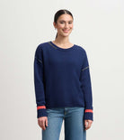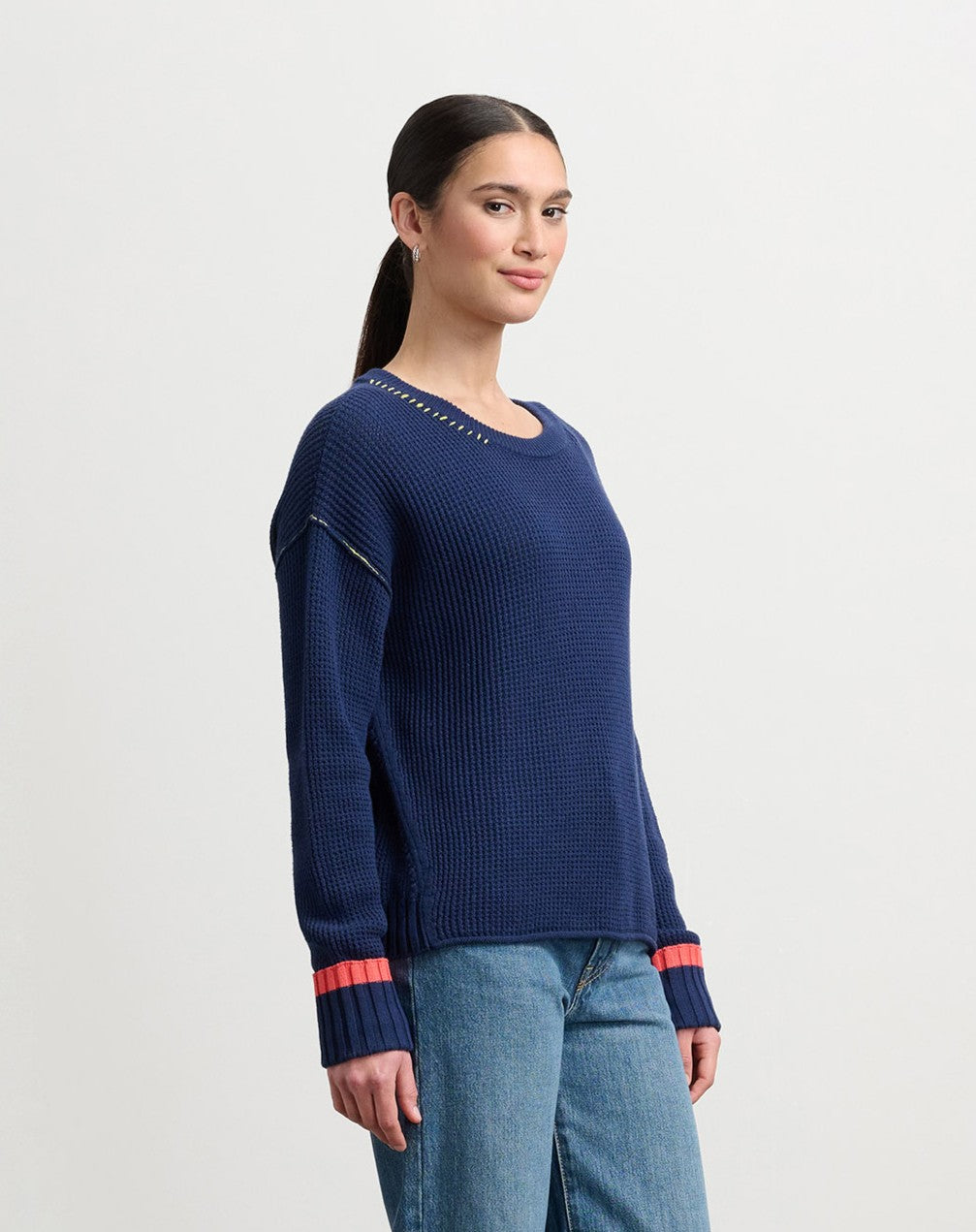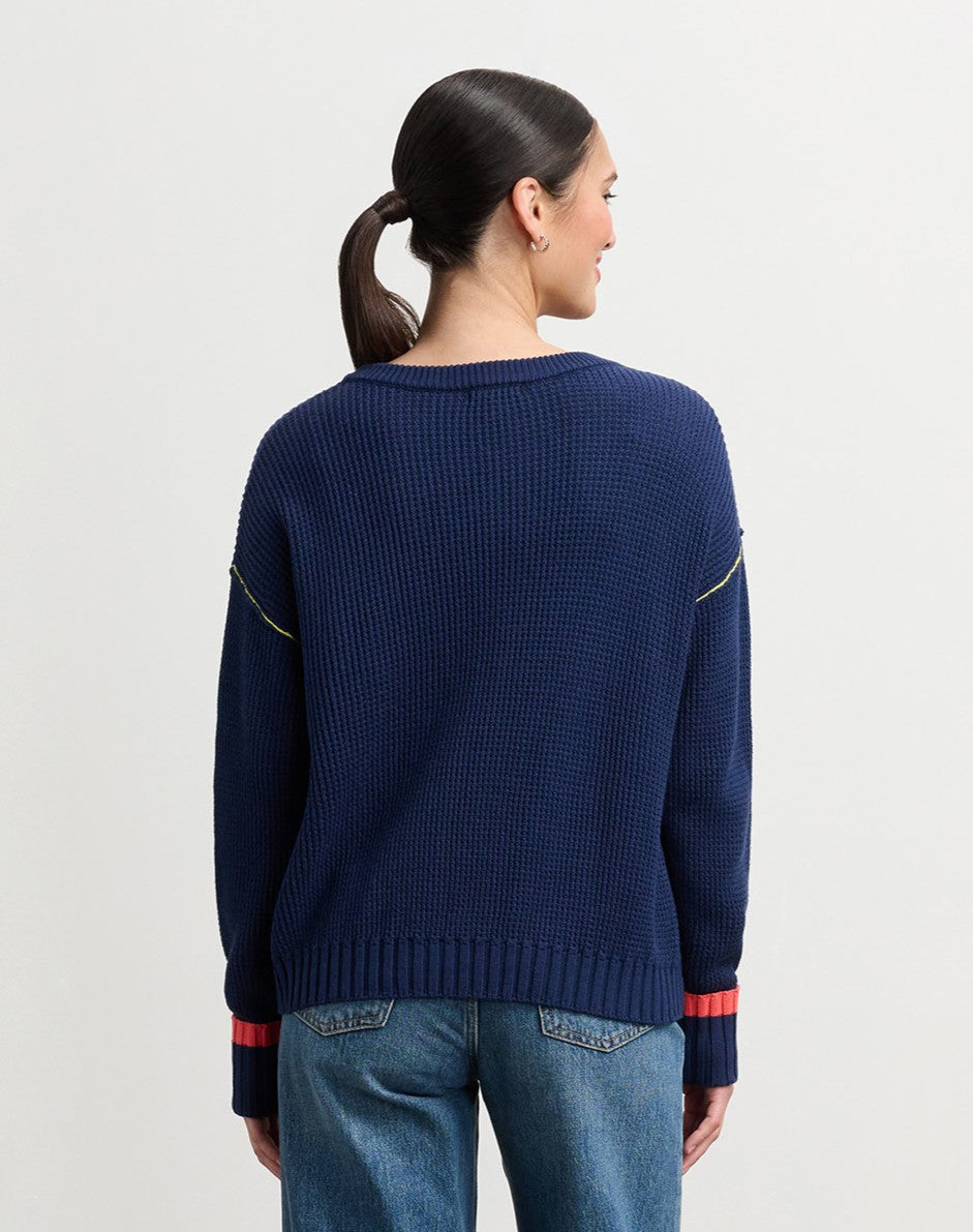 Cozy up in this navy waffle knit sweater that blends comfort with playful style. The soft cotton and viscose mix keeps you warm without the bulk, while colorful blanket stitching and coral striped wrist details add personality to your everyday look. Perfect for casual outings or relaxed weekends—a versatile piece that works as hard as you do.